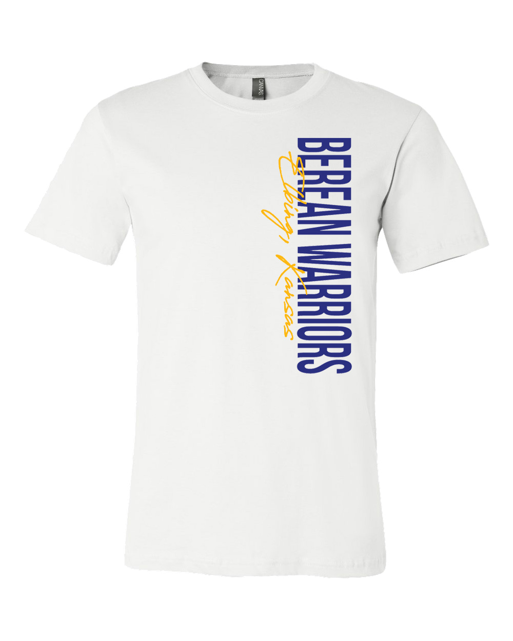 White t-shirts are ring-spun Bella/Canvas brand with a two-color vertical imprint. Available in adult and youth sizes.