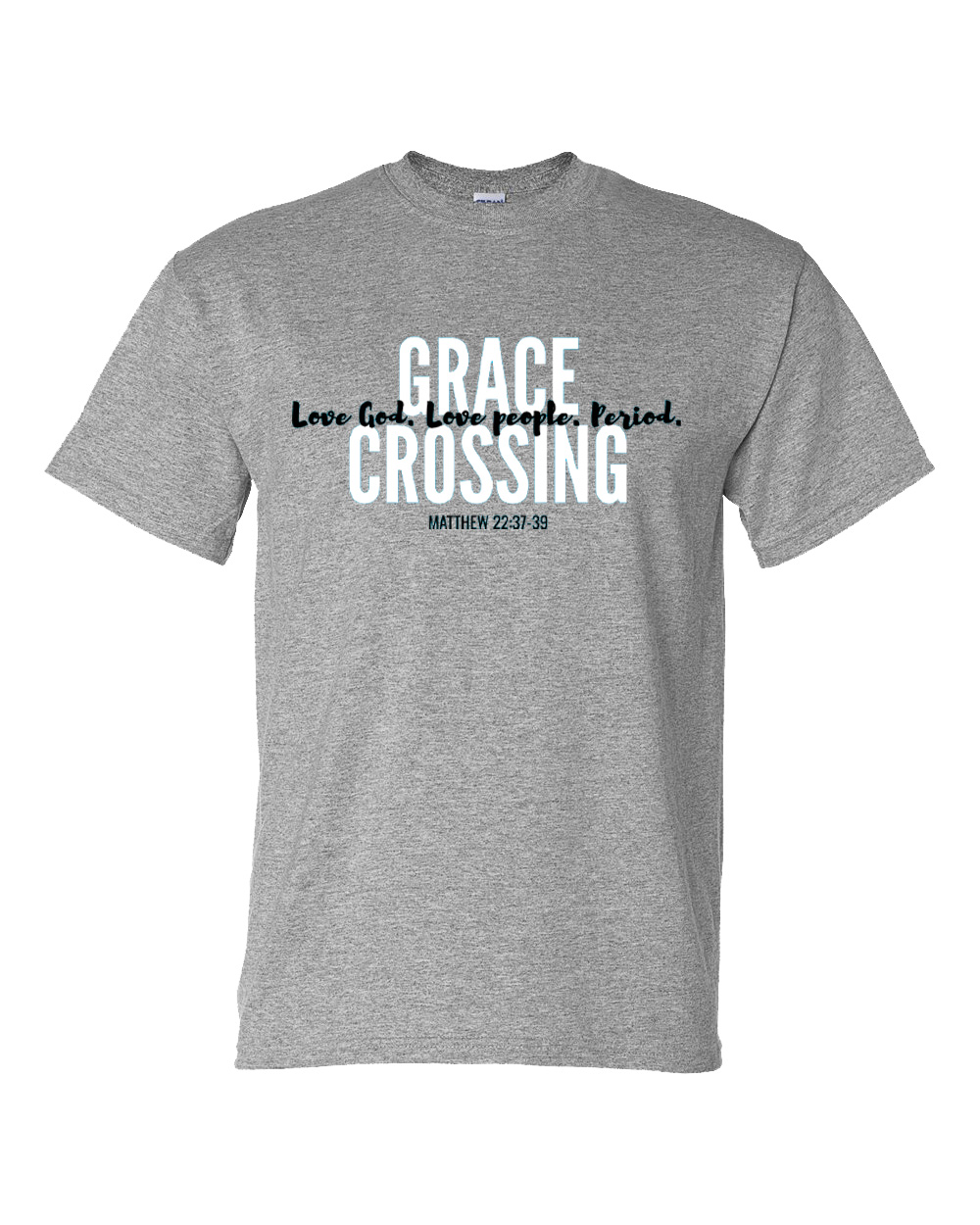Gildan 50/50 tee is in sport grey with a 2-color front imprint. (8000)