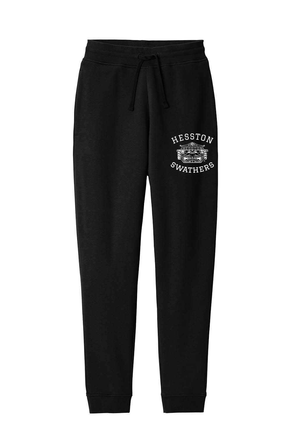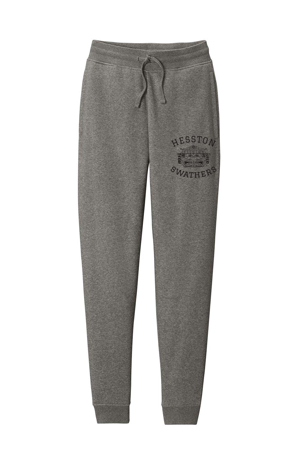 Joggers are District brand 8.3 0z. 60/40 in Heather Grey and Black with pockets. The joggers have a 1-color imprint on the left leg (DT6107 or Similar).