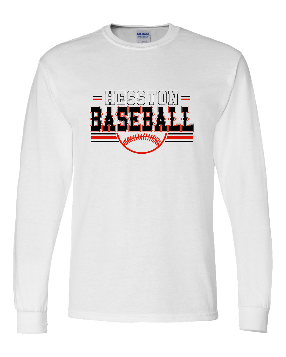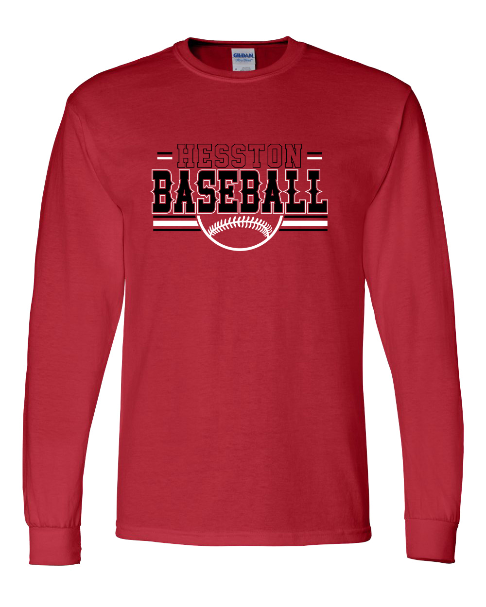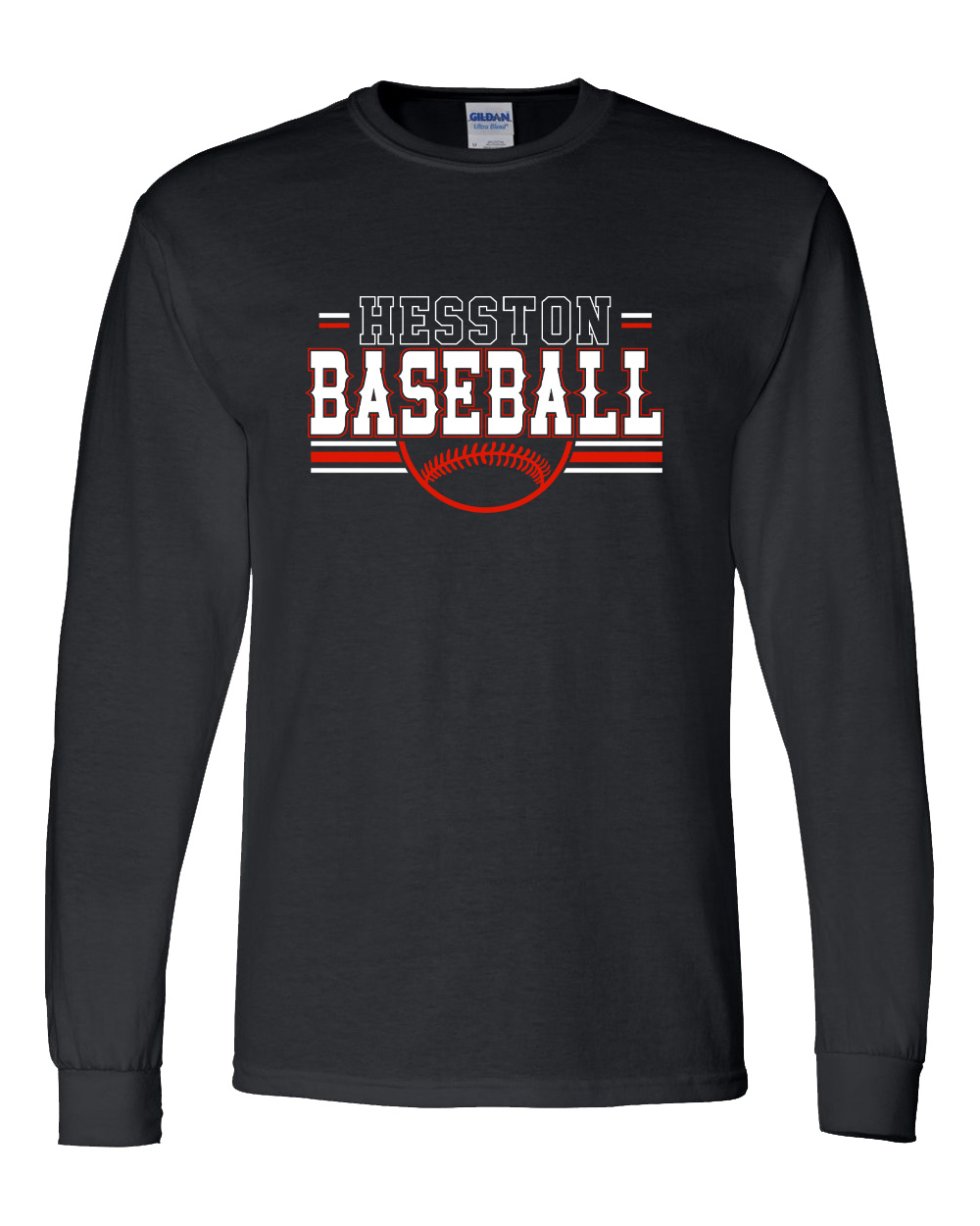 Long-sleeve tees are solid Gildan 50/50 in black, white, red and heather gray with a 2-color front print. Available in adult and youth sizes. Youth sizes may need to be 100% cotton. Option for a name and number on the back of the shirt.