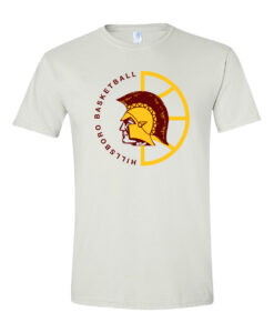 Tee is a Gildan soft-style in sport gray, maroon, gold, or white with a front imprint.
