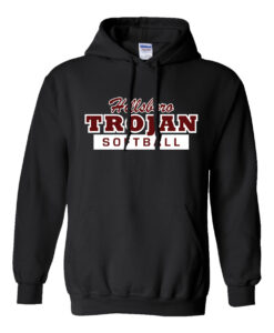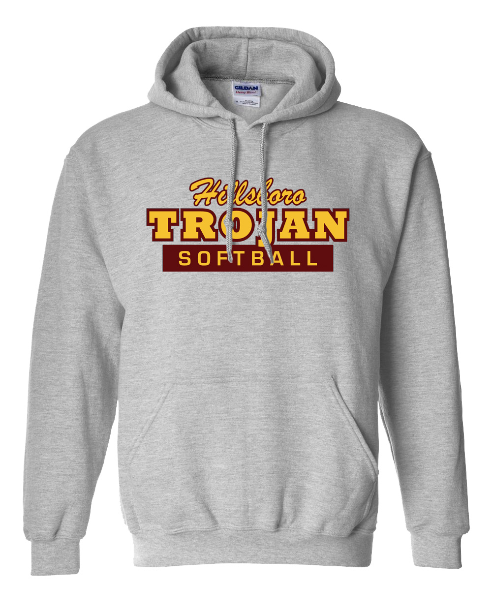 Hoodies are Gildan 50/50 in sport grey, maroon, or black with a front imprint. Available in adult and youth sizes.
