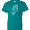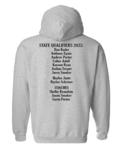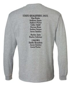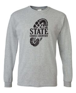 Long sleeve tees are 50/50 Gildan in heather grey with a black print. Available in adult and youth sizes.