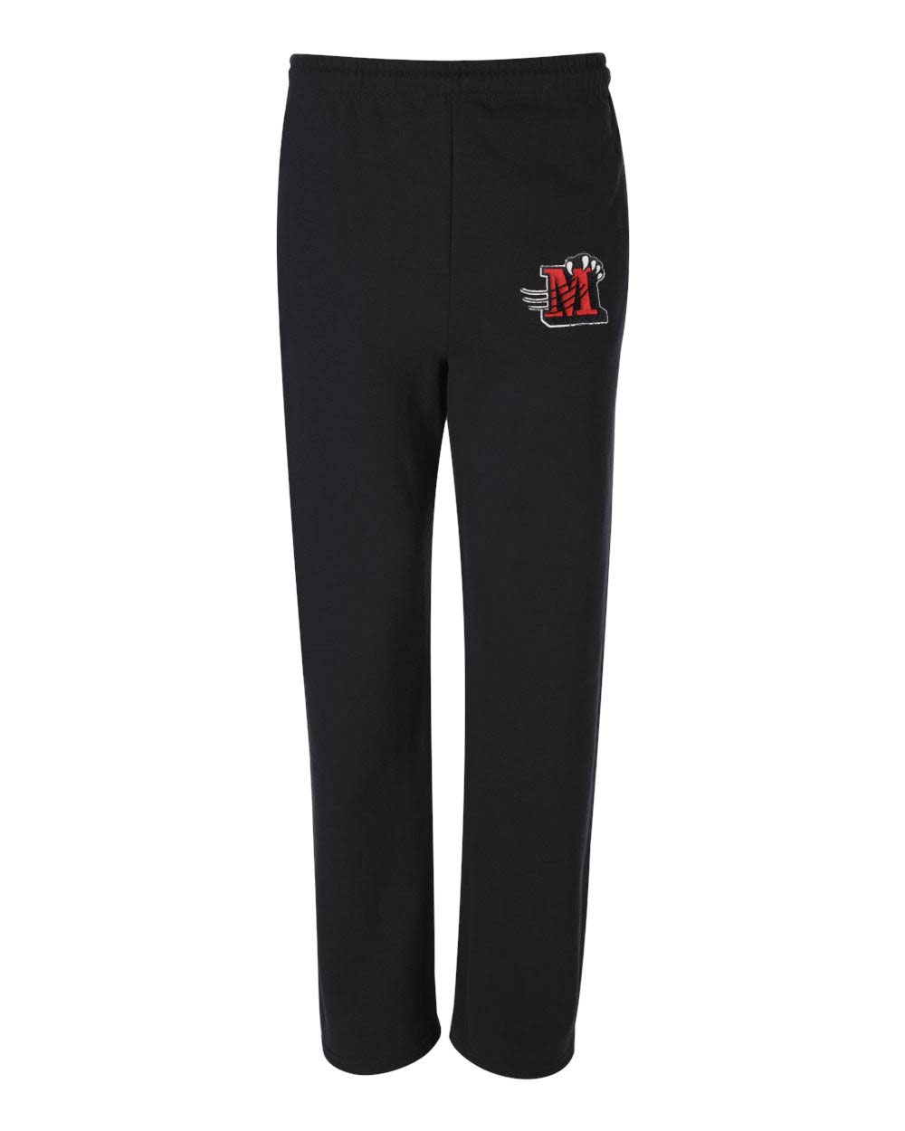 Sweatpants are Port & Co 7.8 oz 50/50 fleece pants with open bottoms and pockets. Pants have a 3-color embroidered design on the left leg. (PC78P or Similar) Youth sweatpants will have elastic bottom cuffs.