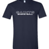 Tees are Gildan 50/50 in navy with a white imprint. Youth tees may be a different brand.