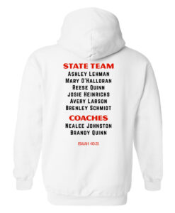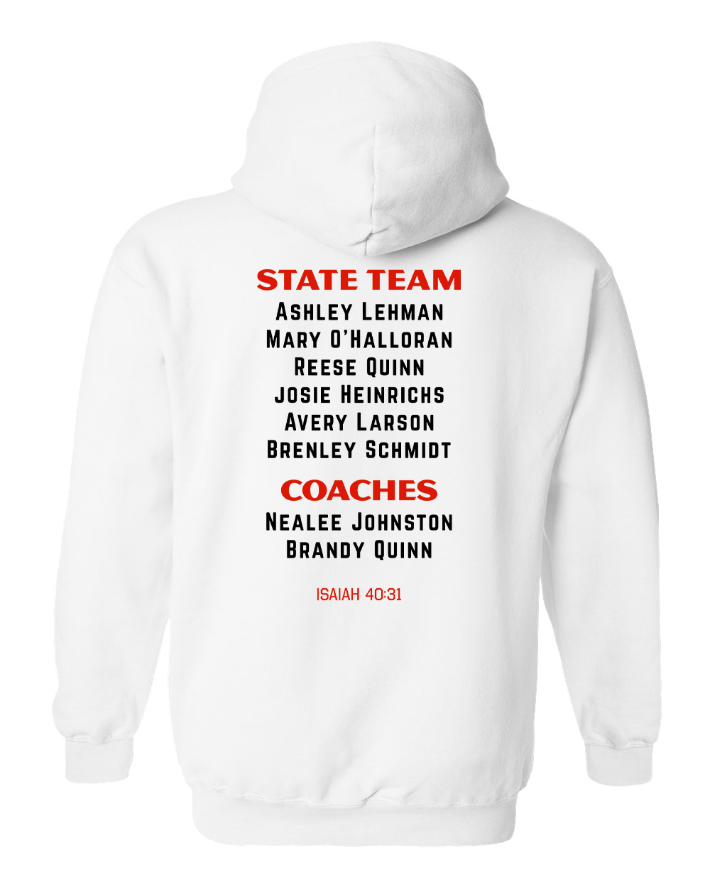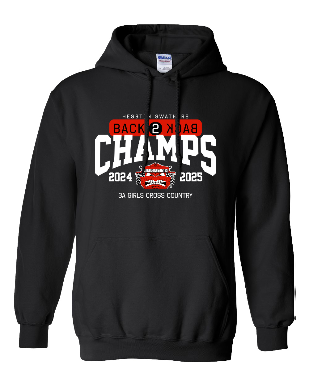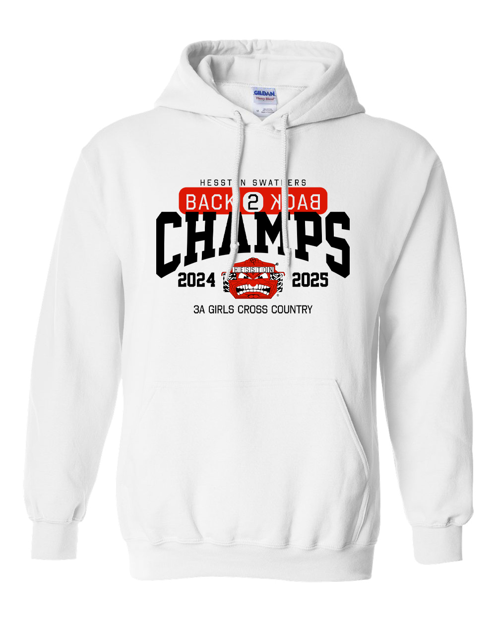 Hoodies are Gildan in black or white with front and back imprints. Available in adult and youth sizes.