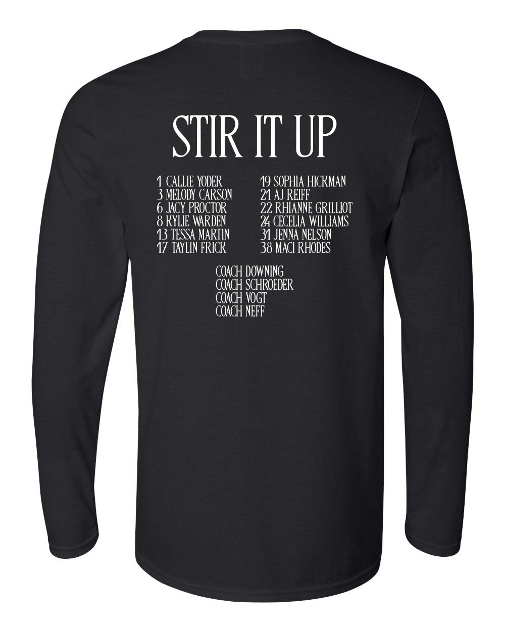 Long sleeve tees are 100% Cotton Gildan Softstyle in Black with a 2-color front print and 1-color back print. Available in adult and youth sizes.
