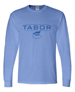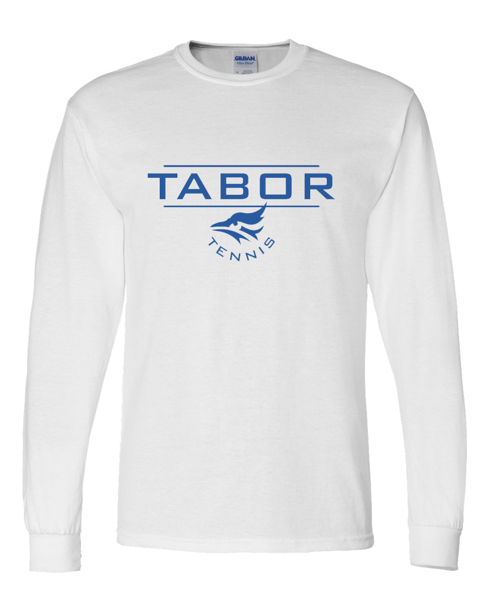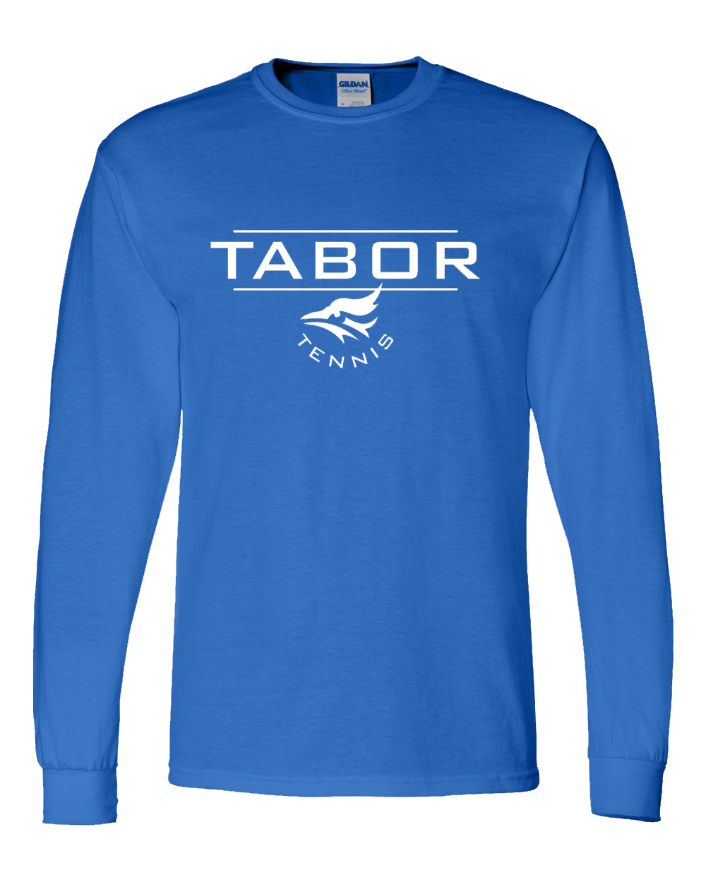 Long-sleeve tees are 50/50 Gildan in royal blue, white, sport grey, and columbia blue. Adult and youth sizes are available.
