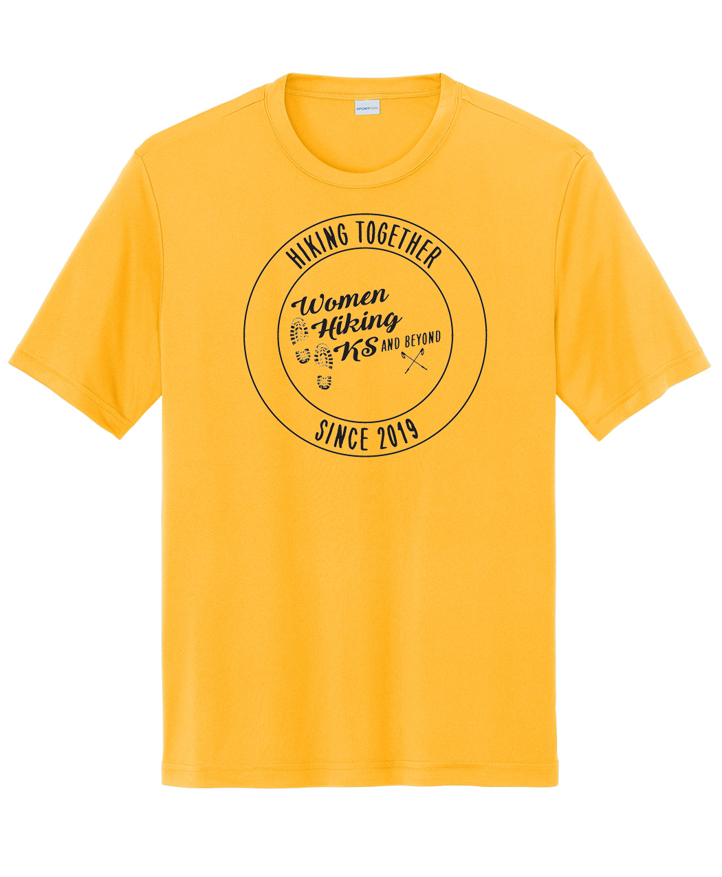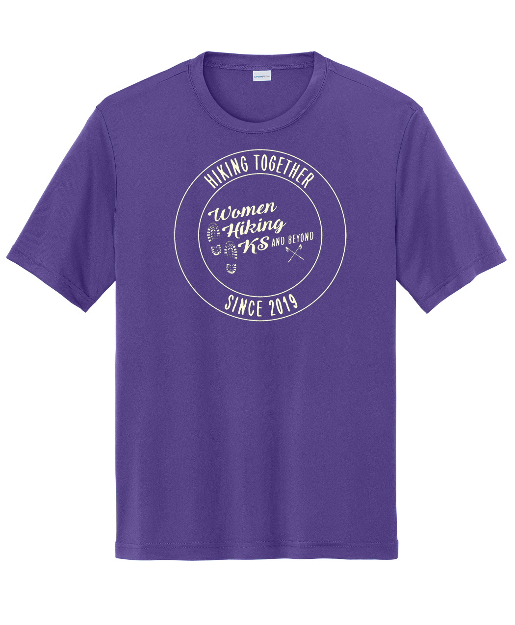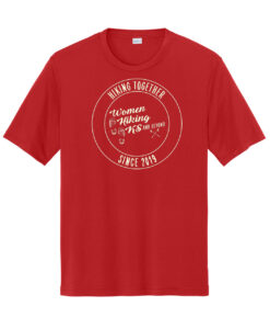 Unisex cut shirts are 100% polyester tees with the Women Hiking Kansas Anniversary imprint on either red, purple, or gold. See sizing chart in the gallery below.
